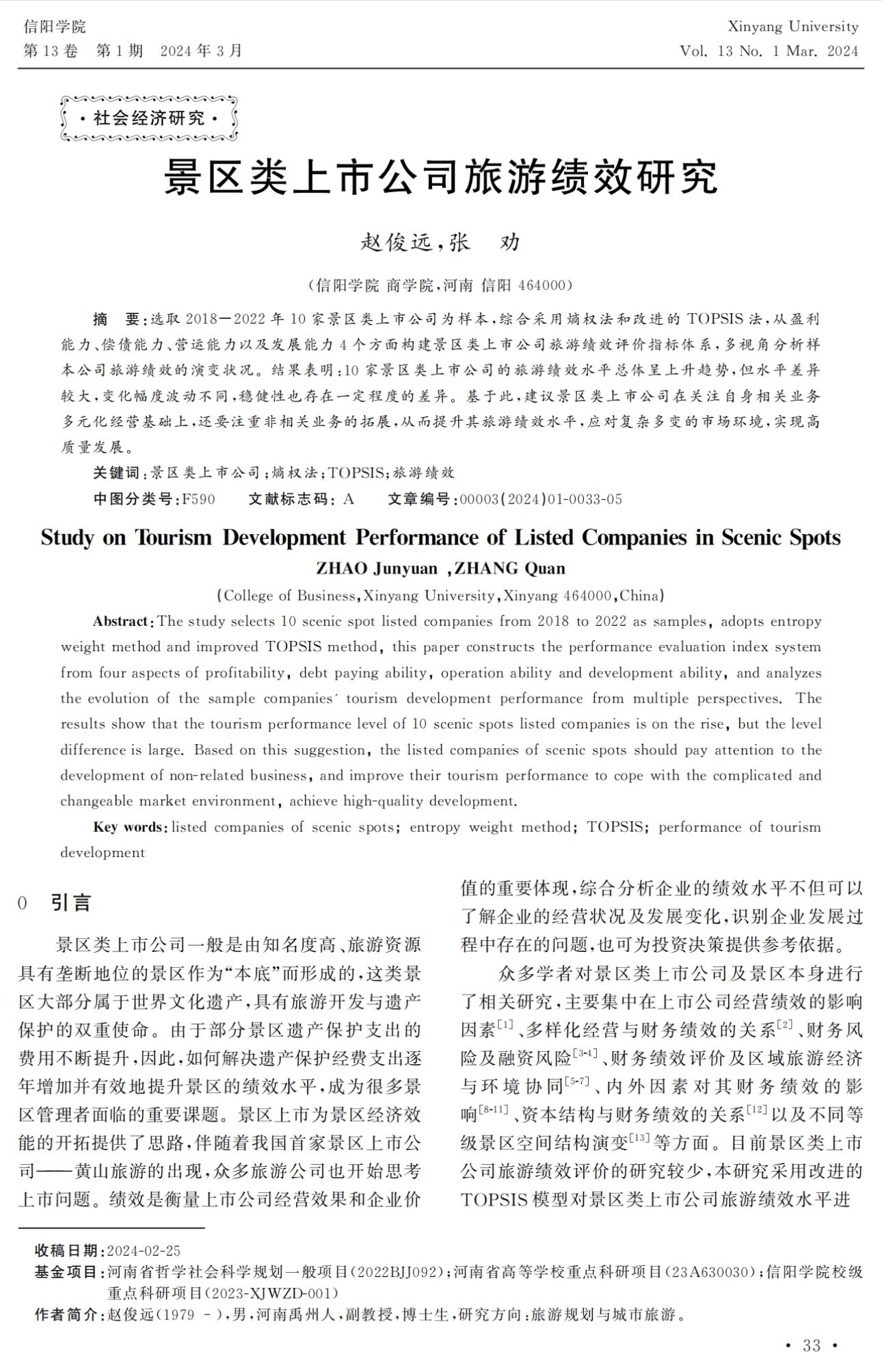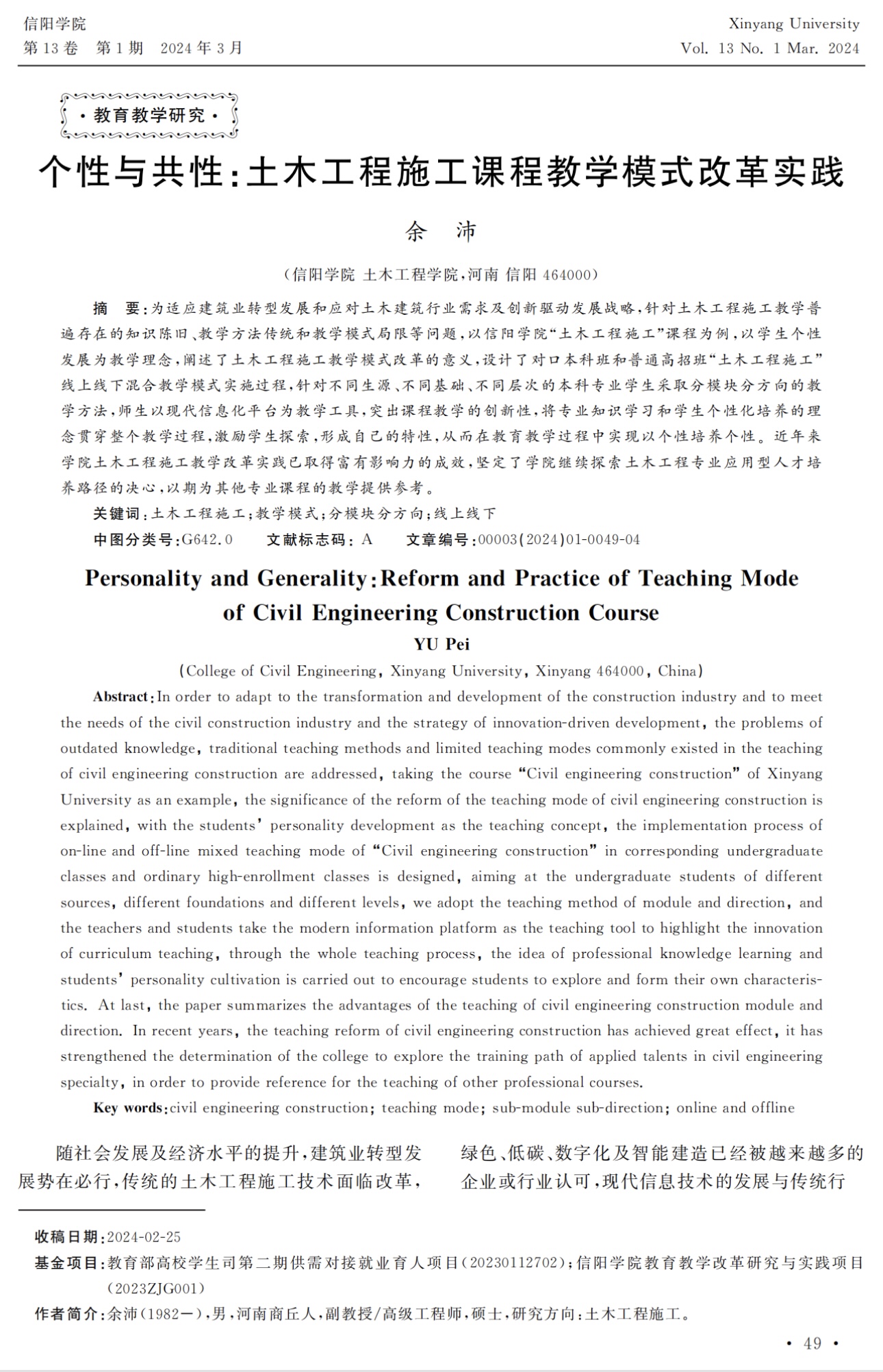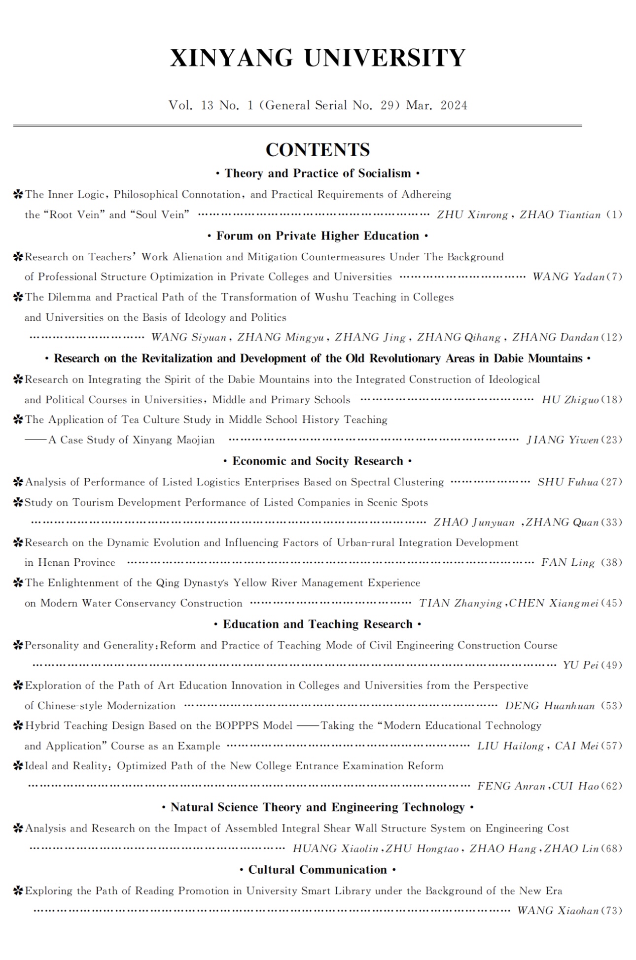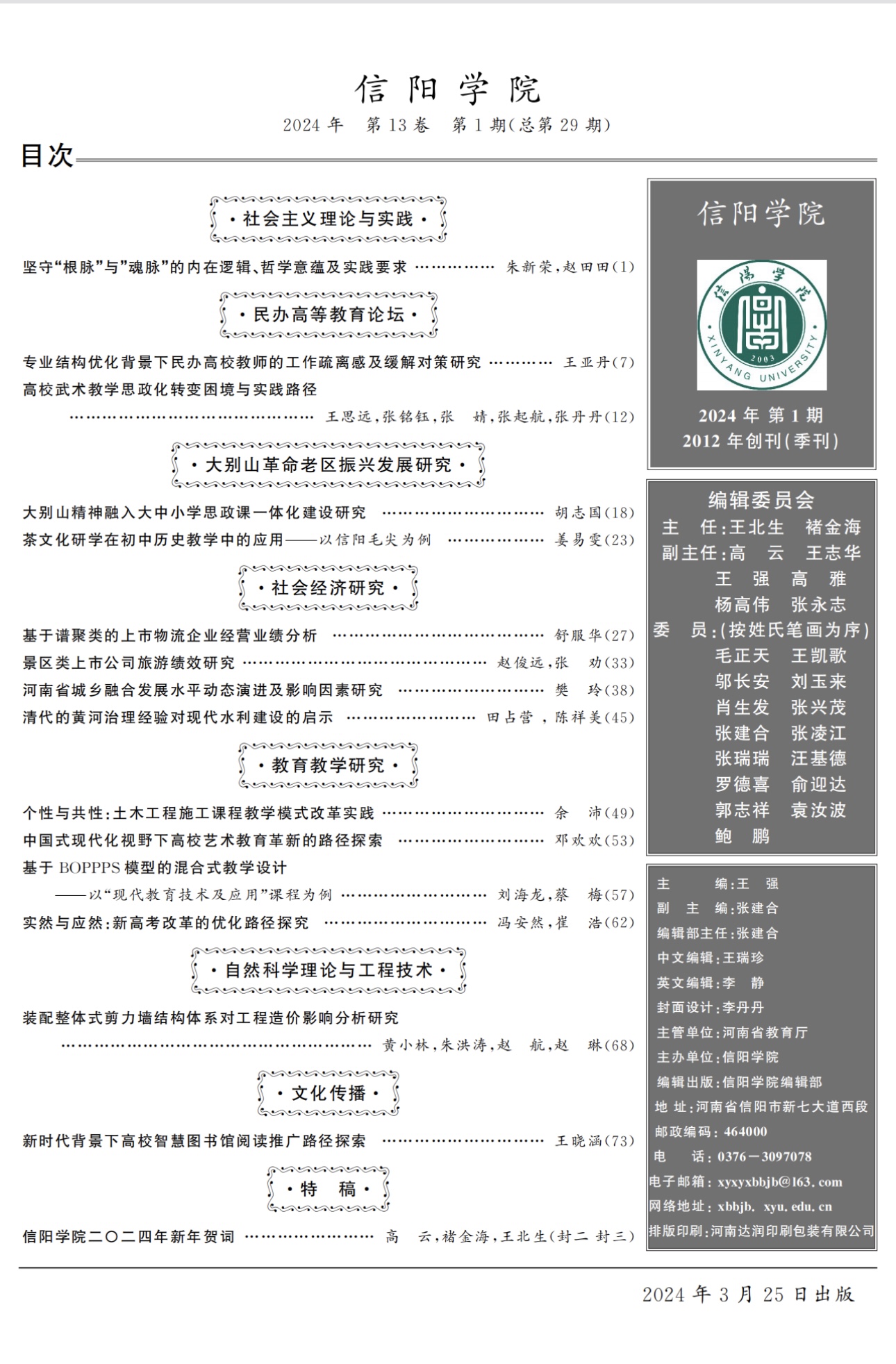 《信阳学院》2024年第1期目次及篇首页